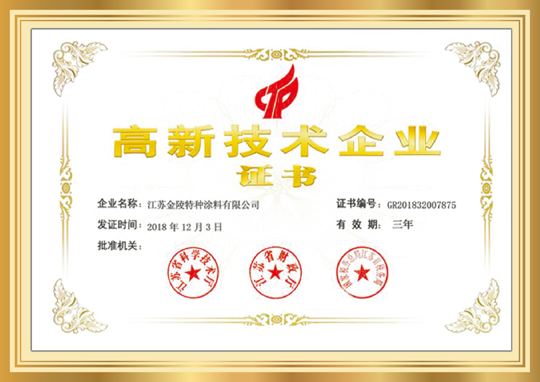 冠名:江蘇金陵特種涂料有限公司,被授予國家高新技術企業